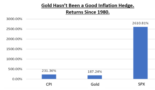 Gold has not been a good inflation hedge. To illustrate this point here’s a chart of the Consumer Price Index (CPI), Gold, and the S&P 500 returns since 1980. Our official measure of inflation (CPI) has risen 231% since 1980. The S&P 500 has gained an astounding 2,600%. Gold is up 187%, underperforming both statistical inflation, and the S&P 500. Stocks (or real estate) have been better alternatives as an inflation hedge.